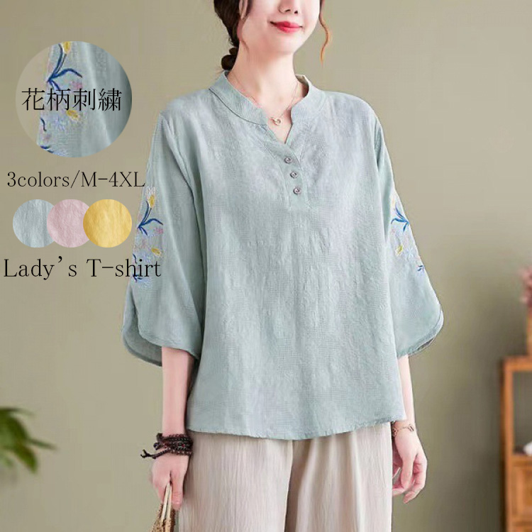 ブラウス レディース 7分袖 春 夏 トップス 丸首 綿麻 刺繍 体型カバー ゆったり 大きいサイズ プルオーバー カジュアル 前後差 30代 40代 50代