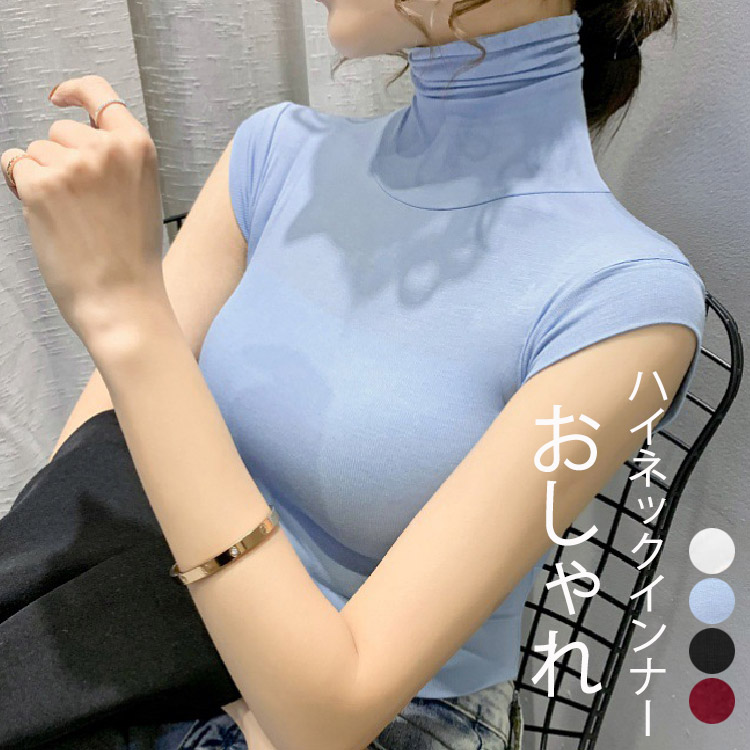 首もとをおしゃれに隠せる 薄手ハイネックインナー 重ね着インナー 春物 夏物 サマー フィット感 ストレッチ 伸縮性 ハイネックtシャツ 短袖 ノースリ おしゃれ セクシー