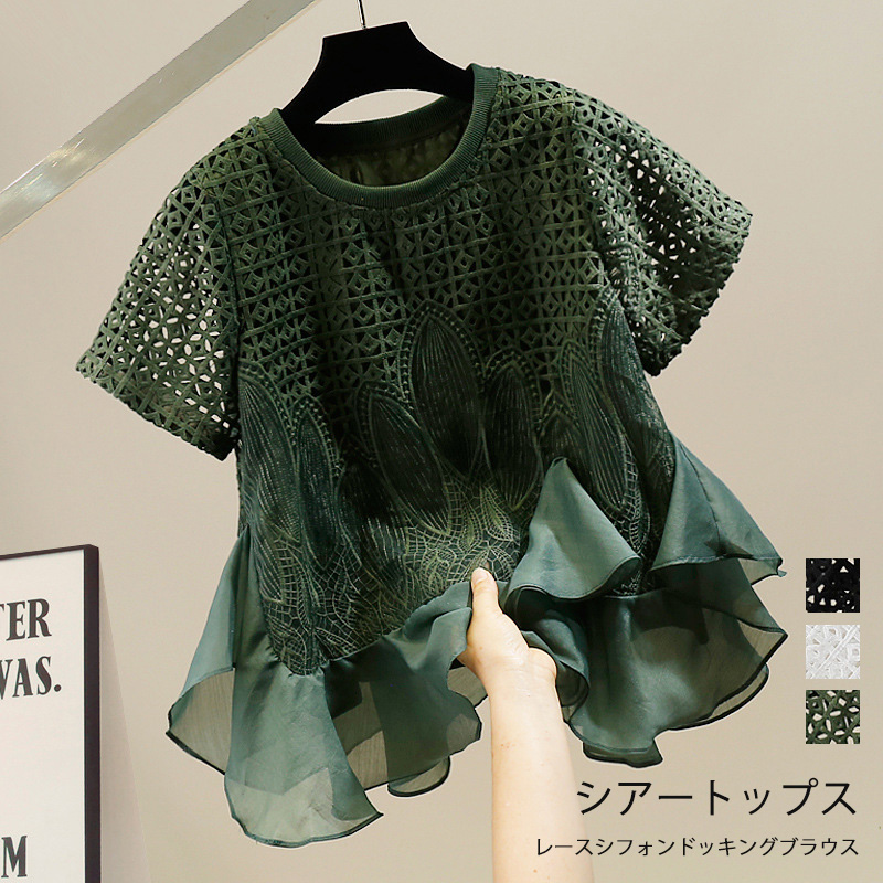 レースブラウス レースカットソー レースシャツ レーストップス 夏 半袖 おしゃれ きれいめ 上品 シアートップス 半そで トレンド 半袖シャツ ドッキング 切り替え 大人
