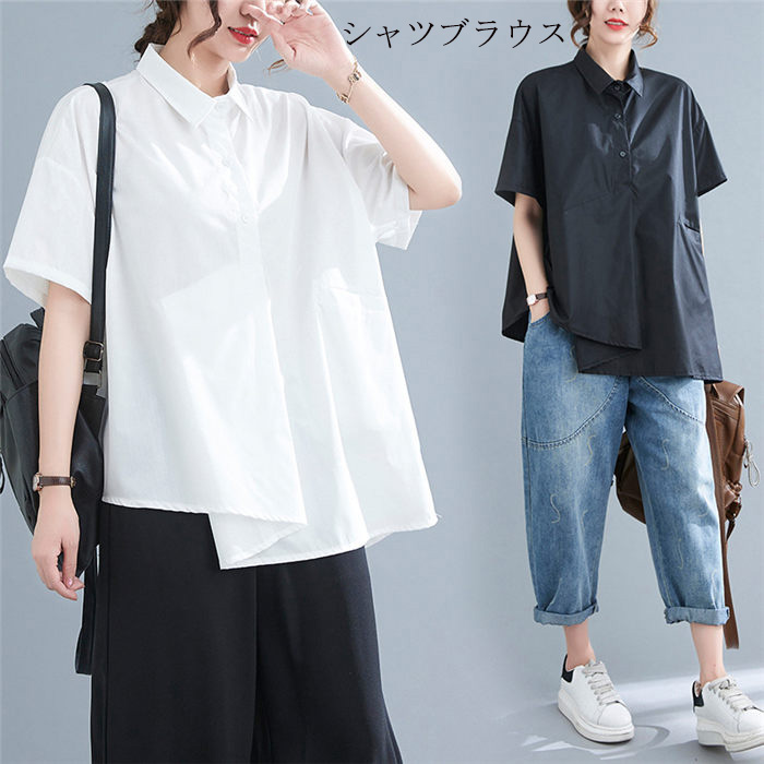 ブラウス レディース 白シャツ 夏 トップス チュニック 半袖 大きいサイズ 無地 綿麻混 シャツ 涼しい オシャレ 前後差 フォーマル 白 黒 通勤 不規則 アシンメトリー シンプル 無地