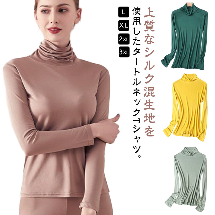 プレゼント 一枚着用 オシャレ 長袖 ハイネック 絹 シルク混 ティーシャツ カットソー タートルネック インナー シルク 重ね着 シンプル シャツ 肌に優しい 敏感肌 低刺激 快適 保湿 汗取り