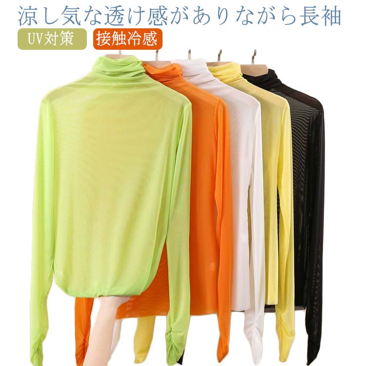 紫外線対策 長袖 シャツ 薄手 ゆったり トップス シアー ハイネック ストレッチ 夏 シアートップス 接触冷感 クール冷感 シースルー セクシー 透け感 レイヤード コーデ 重ね着 レディース 肌