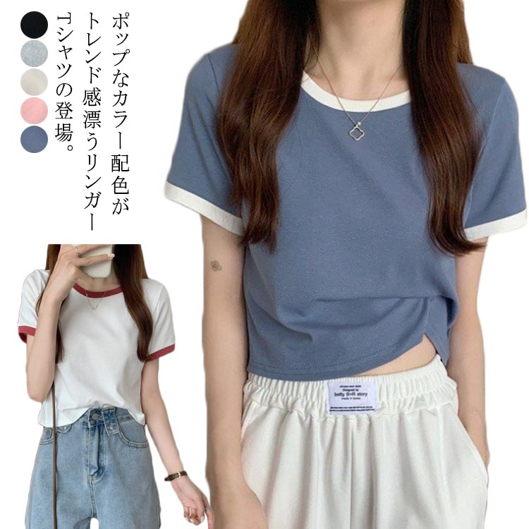 リンガーシャツ コンパクト シャツ レディース トップス 配色 バイカラー 半袖 無地 ショート丈 クルーネック 丸首 カットソー 女子 おしゃれ カジュアル 夏 かわいい