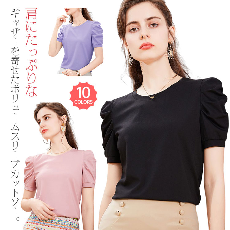 ボリューム 袖タック バルーンスリーブ ギャザースリーブシャツ パワショル フライス 伸び感 カットソー