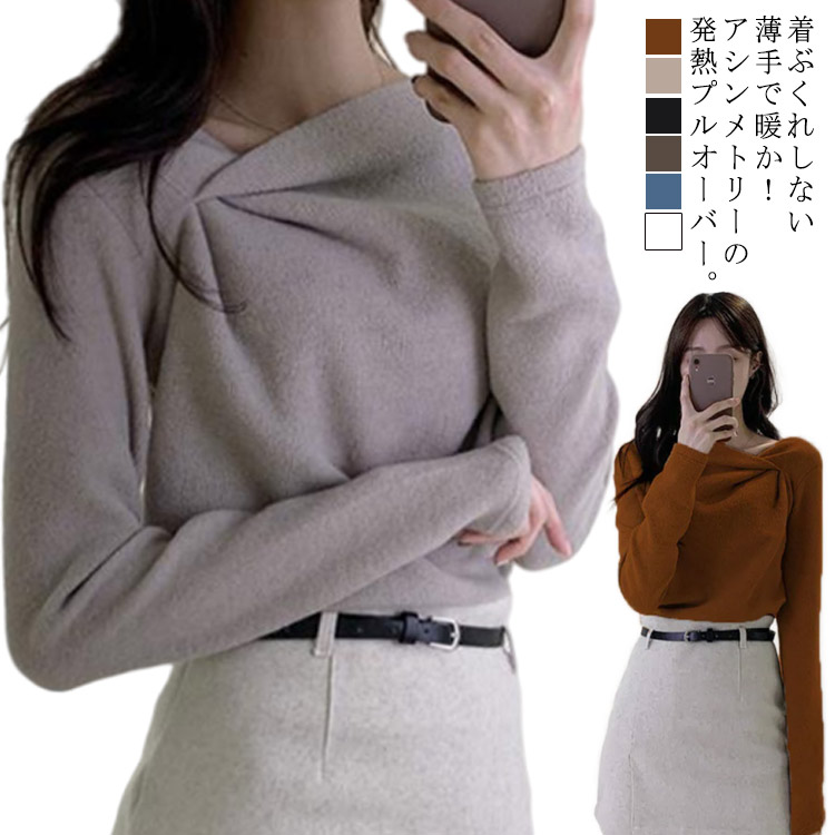 裏起毛インナー 秋冬 チュニック 長袖 セーター ネック 無地 トップス セクシー ねじれ レディース