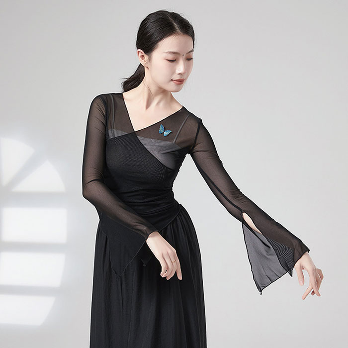 ダンストップス 長袖 やや透け感 トップス レッスンウェア ダンス着 バレエ レッスン着 ダンストップス