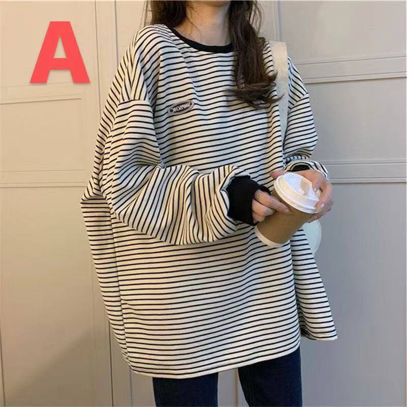 ロングシャツ レディース 大きいサイズ ボーダー柄 ボーダーシャツ 春秋 秋服 春服 長袖 薄手 丸首 トップス ゆったり 可愛い カジュアル 245