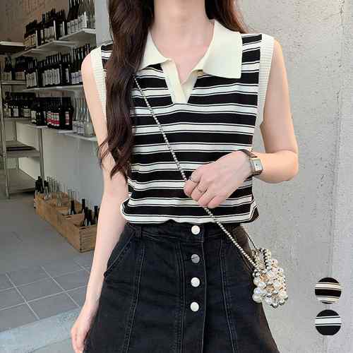 襟付き ボーダーニット 袖なしショート丈トップス レディース プチプラ クロップド丈カットソー 1枚で決まる ポロシャツ 韓国オルチャン夏服 ニットTシャツ春秋 薄手ニット大人女子