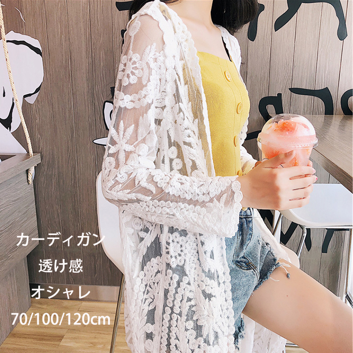 夏カーディガン サマー 無地 ホワイト ブラック ロング丈 ミモレ丈 総レース 透け感 フレア レディース ロングカーディガン 羽織り 体型カバー 2021春夏