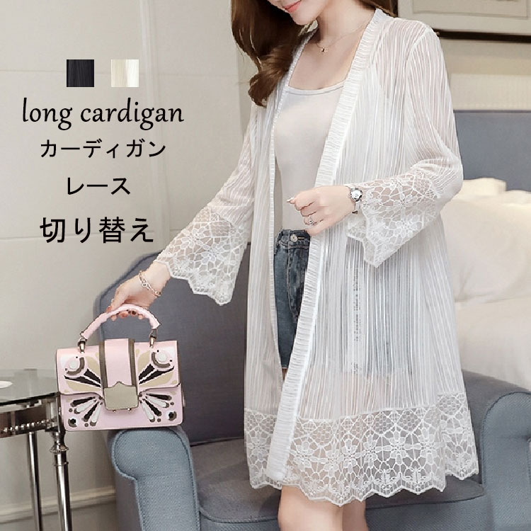 ロングカーディガン レディース カーディガン 薄い レース ロングカーディガン 長袖 おしゃれ フリルレースロングカーディガン レースカーディガン ホワイト ブラック ライトアウター