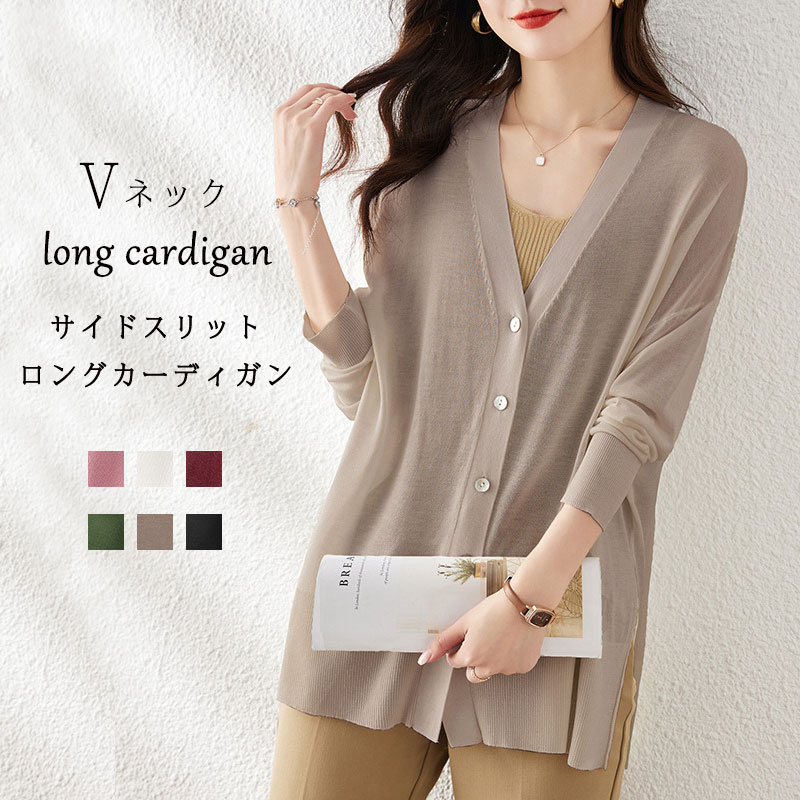 ロングカーディガン レディース カーディガン 薄い 透かし Vネック リブ スリット ロングカーディガン 長袖 おしゃれ フォーマル 通勤 仕事 事務所 ベーシックカラー