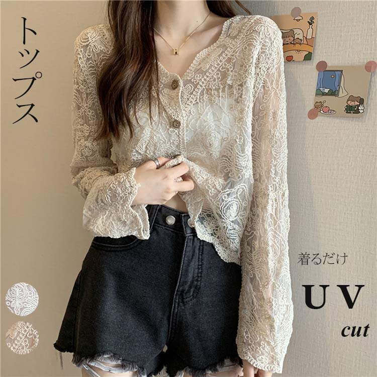 可愛いレースカーディガン カーディガン レーストップス レース トップス UVカット 長袖 ショート丈 ショートトップス ショート丈日焼け止めトップス 可愛い UV対策 ボタン止め