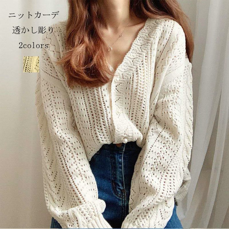 カーディガン ニット レディース 春 夏 秋 ニットカーデ 長袖 Vネック ショート丈 総レース トップス コーデ 透かし 薄手 カジュアル