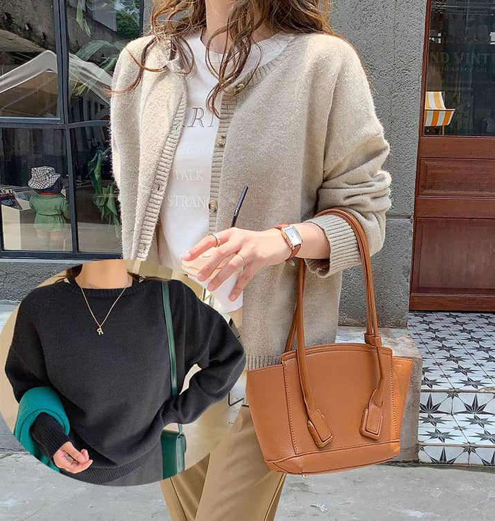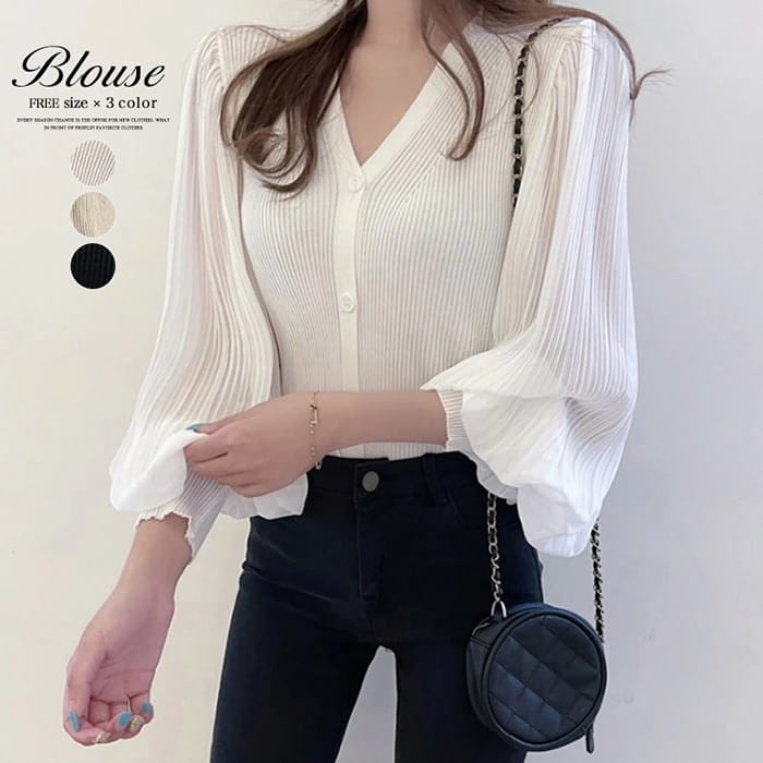 韓国ファッションレディース ニットカーディガン ドッキング シャツ トップス 長袖ドレープ ボリューム袖3カラー