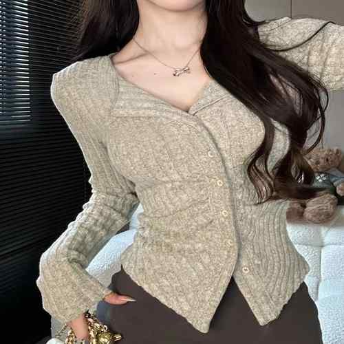 ニットトップス 前開き 編み フィット感 無地 セクシー 大人 可愛い おしゃれ 着やせ オルチャン 長袖トップス タイトトップス 韓国ファッション