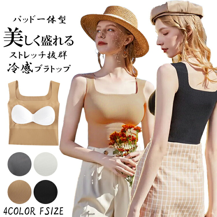 4カラー ストレッチ冷感ブラトップ パッド一体型 ブラトップ スクエアネック ノンワイヤーレディースファッション トップス キャミソール