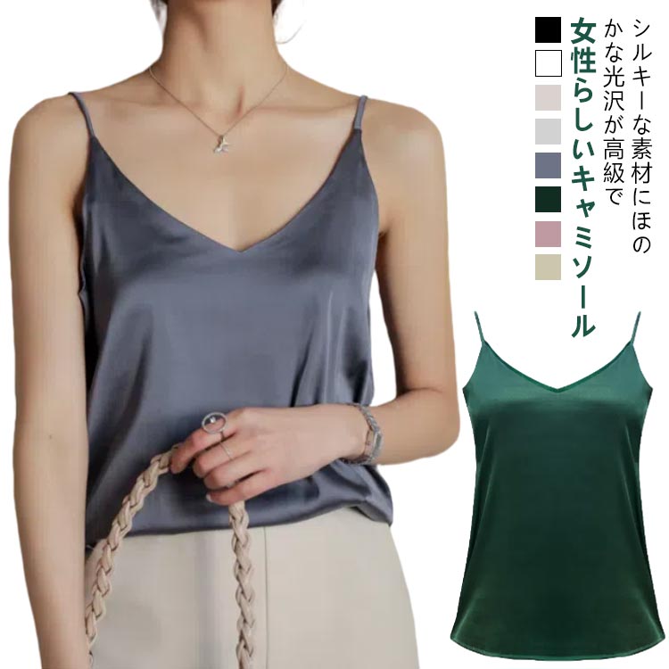 キャミ ランジェリー ルームウェア サテンキャミソール シルクタッチ エレガン 白 部屋着 Vネック