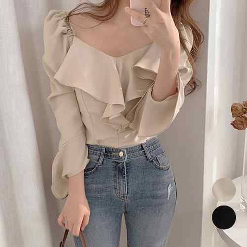 レディース ラッフルカラー とろみブラウス パフスリーブ トップス フレア袖 おしゃれ ブラウス きれいめ 春先行 人気 オルチャンブラウス 大人可愛いブラウス ペンタゴンネック
