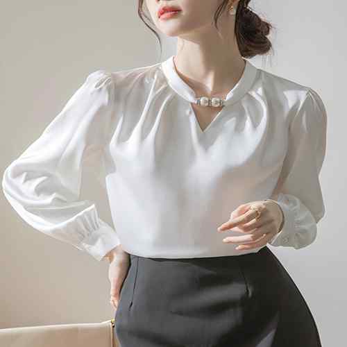 フォーマル スタンドカラーシャツブラウス 衿元パール オフィスワイシャツ 20代30代40代 通勤服長袖 大人上品春秋夏 卒業式ブラウス白 着やせとろみシャツ 入学式卒園式入園式