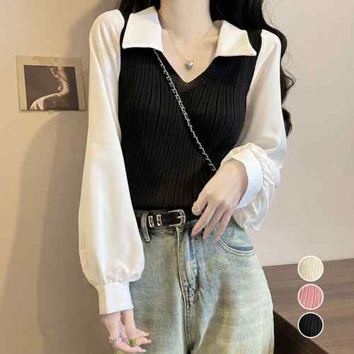 ニットトップス Vネック レディース リブニット 襟付き 異素材切替 ニットソー 着やせ重ね着風ニットトップス秋服 レイヤード風ニット お洒落ニットシャツ 無地ニットブラウス