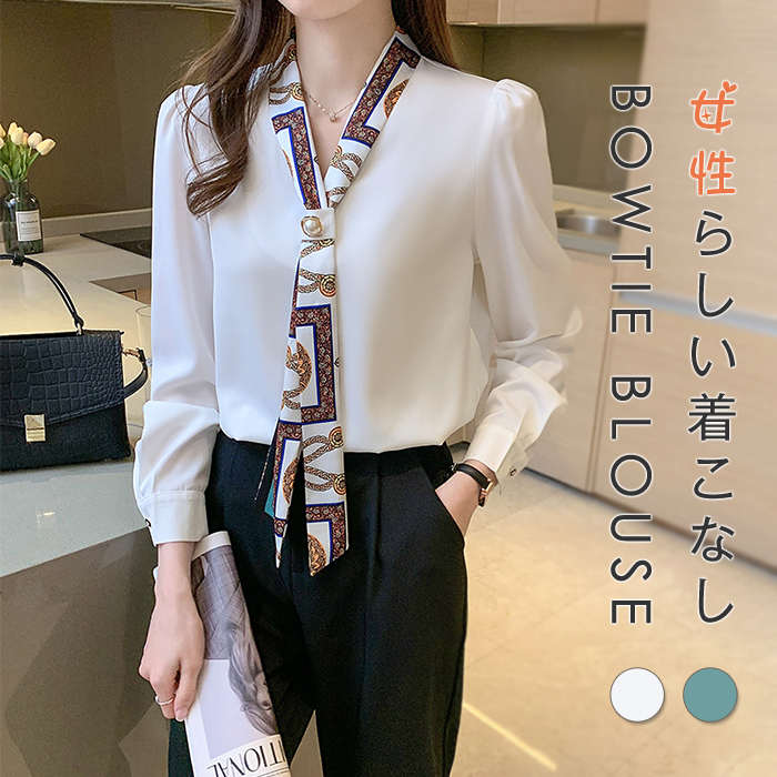 ブラウス ボウタイ 長袖 レディース vネック シャツ フォーマル オフィス 春秋 大人 きれいめ お洒落 通勤 ビジネス スーツインナー ショート丈 シンプル とろみ エレガント フェミニン カジュ