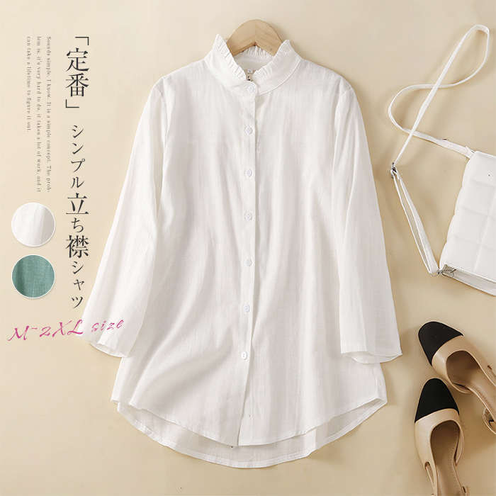 シャツ レディース 長袖 お洒落 立ち襟 綿麻風 ブラウス 前開き オフィス ブラウス 春 トップス きれいめ 大人 カジュアル シンプル 体型カバー オールシーズン 大きいサイズ ゆったり 20代