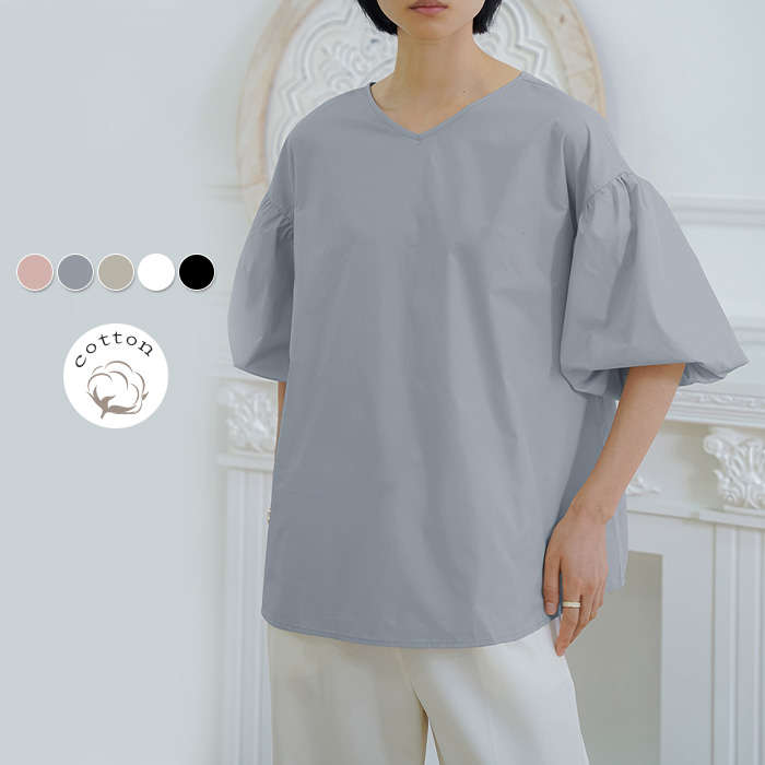 ブラウス レディース シャツ 春夏 薄手 オフィス ボリューム袖 羽織り きれいめ コットン 棉 トップス 七分袖 五分袖 無地 Vネック エレガント 洗える 切り替えブラウス とろみ 春 夏 ホワイ