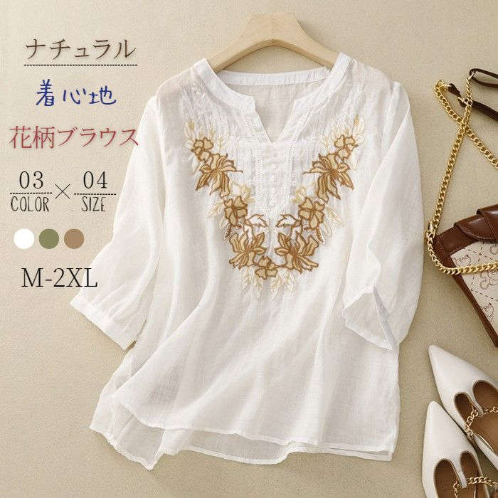 ブラウスシャツ レディース 綿麻風 プルオーバー トップス シャツ カットソー コットン リネン おしゃれ 夏 ゆったり 刺繍 ママ コーデ 薄手
