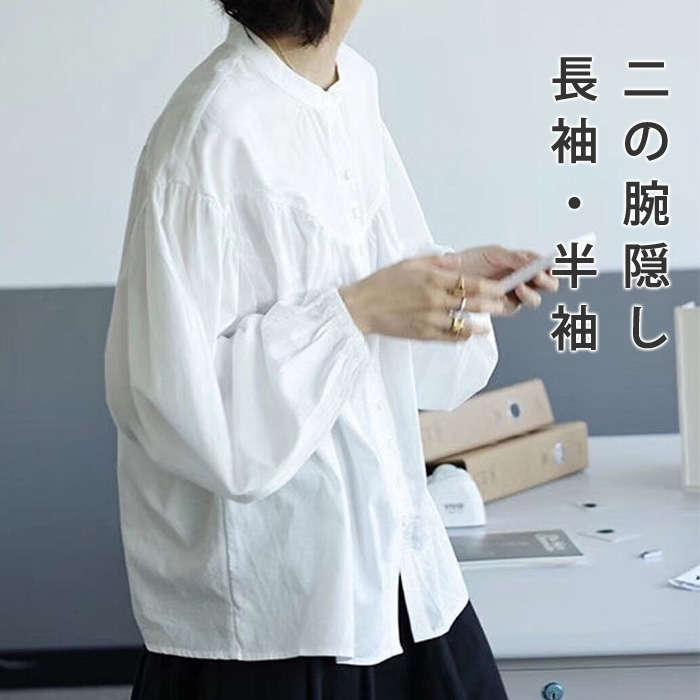 シャツ レディース 長袖 半袖 立ち襟 白 お洒落 ブラウス ポワン袖 前開き オフィス 春 トップス きれいめ 大人 カジュアル シンプル 体型カバー 大きいサイズ ゆったり 通勤 20代 30代