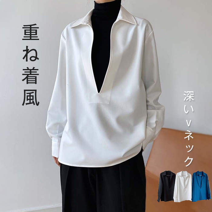 シャツ レディース 長袖 ブラウス vネック トップス 大人 前開き 白シャツ ポワン袖 ショート丈 シンプル きれいめ お洒落 体型カバー 重ね着風 レイヤード風 ゆったり カジュアル ホワイト ブ