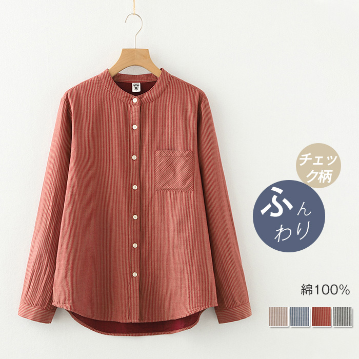 シャツ レディース 長袖 ストライプ チェック ダブルガーゼ スタンドカラー トップス ブラウス ゆったり可愛い きれいめ お洒落 春 夏 秋 デニムシャツ ショート丈 羽織り カーディガン 通勤 カ
