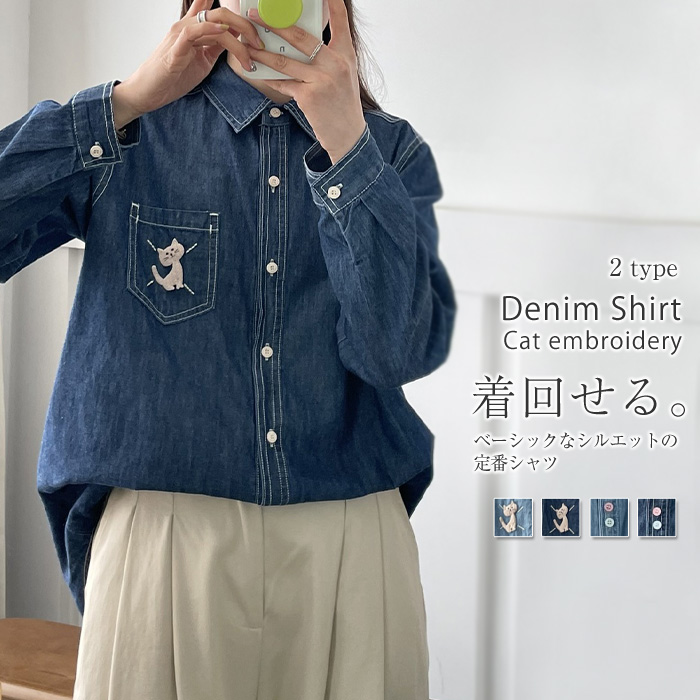 シャツ デニム レディース 長袖 ブラウス トップス ゆったり 刺繡 ねこ ねこ刺繡 可愛い きれいめ お洒落 春 夏 秋 デニムシャツ ショート丈 アウター 羽織り カーディガン 通勤 カジュアル