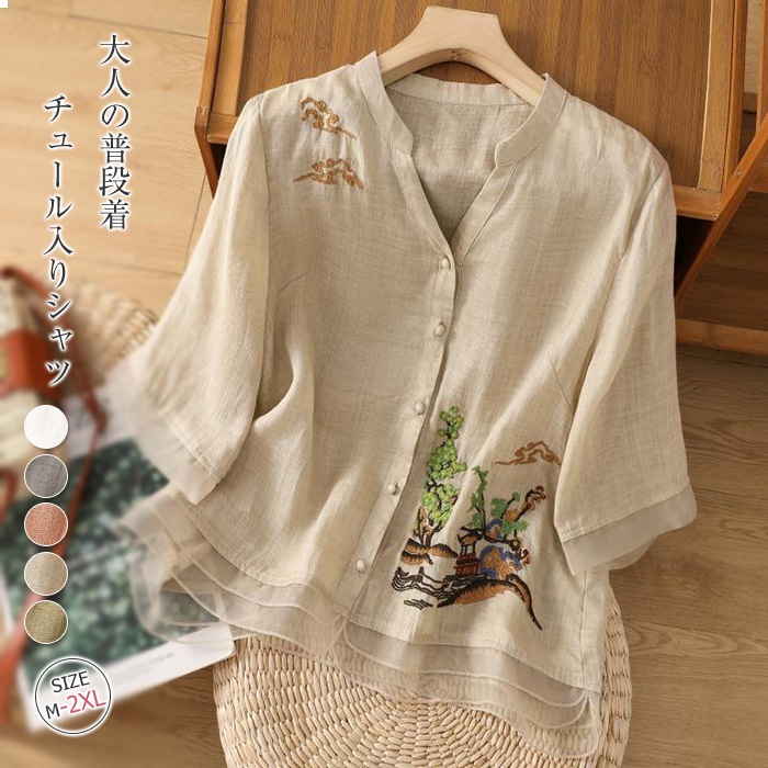 キーネック ブラウス レディース 刺繍 シャツ ブラウス トップス カジュアル 体型カバー ゆったり シンプル 着回し ナチュラル フェミニン 30代 40代 50代
