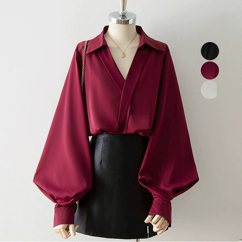 ボリューム袖 ブラウス プルオーバー Vネック レディース 長袖 襟 バルーン袖 パフスリーブ オフィス OL フォーマル ゆったり きれいめ 上品 おしゃれ 無地 シフォン 大人 トップス 春秋 ス