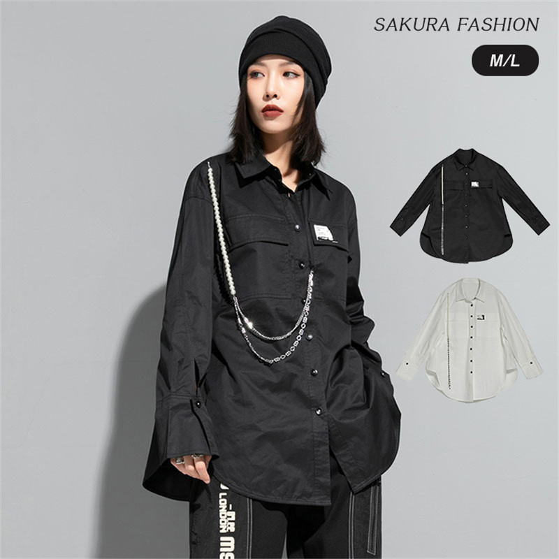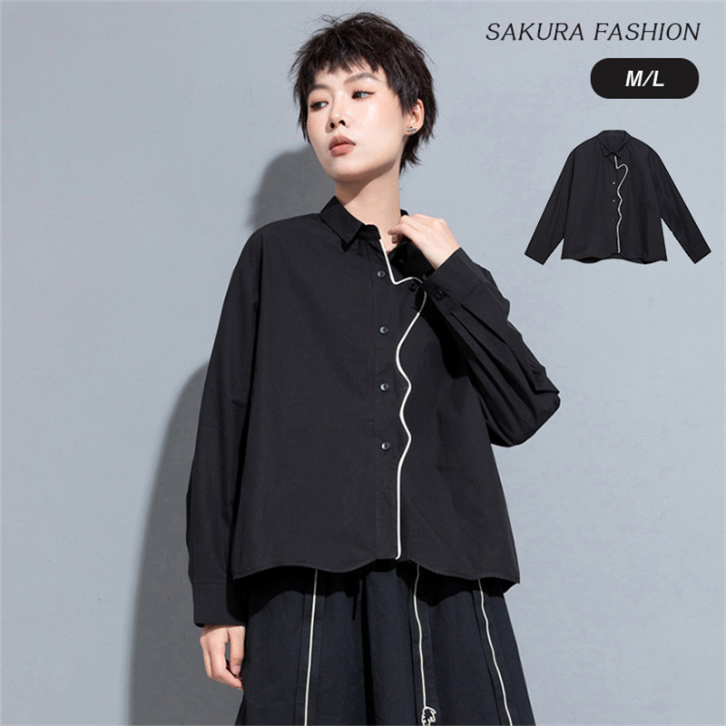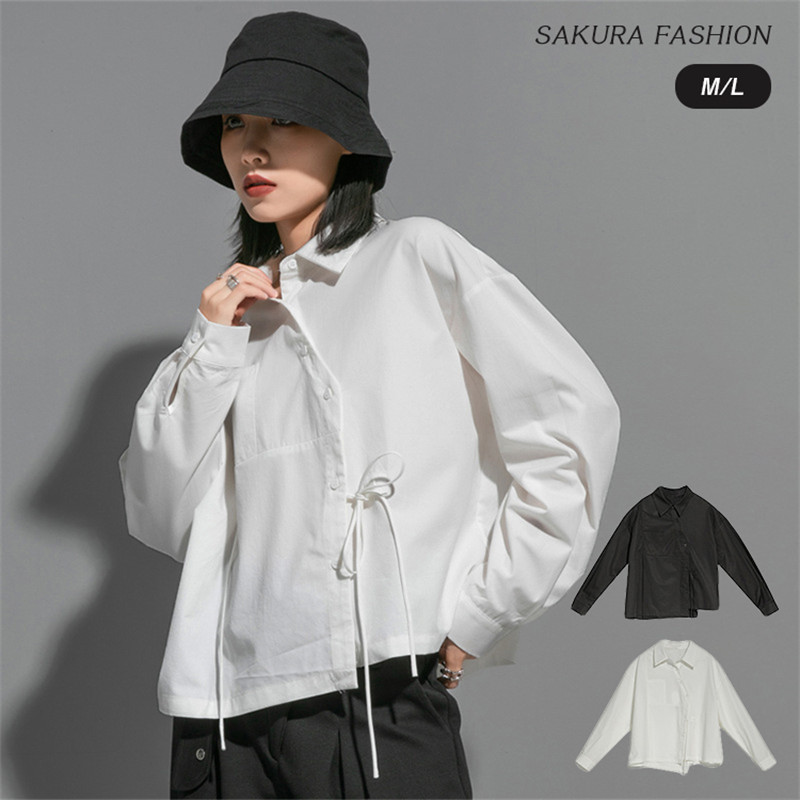 シャツ レディース トップス ブラウス シャツブラウス 長袖 綿 ゆったり 春秋 羽織り 個性派 アシメトリーシャツ ブラック 白 黒 ホワイト M L
