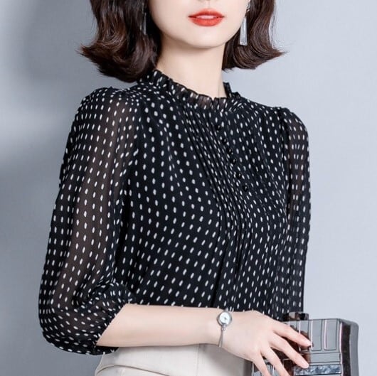 トップス 人気 おすすめ おしゃれ お洒落 激安 安い プチプラ ブラウス レディース シャツ 半袖 美シルエット 七分袖 スタンドカラー フリル ドット 水玉 シフォン プリント 韓国
