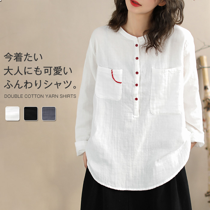 シャツ レディース ガーゼ ブラウス 長袖 おしゃれ オフィス 面接 トップス ダブルガーゼ コットン 綿100% クルーネック 前開き カジュアル 無地 体型カバー オフェス シンプル 着回し 通勤