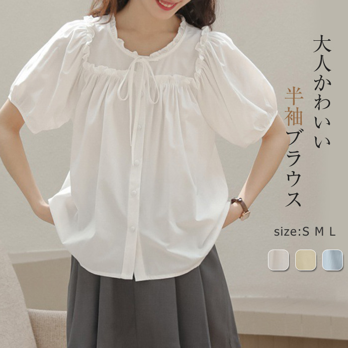 ブラウス レディース 半袖 シャツブラウス かわいい おしゃれ 綿 涼しい きれいめ フレア 春服 ビジネス ボリューム袖