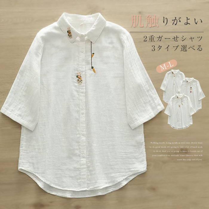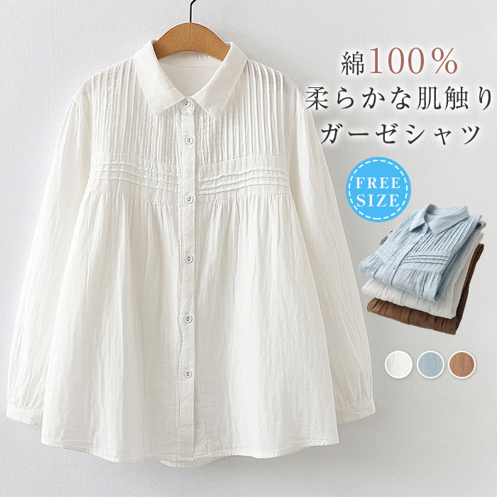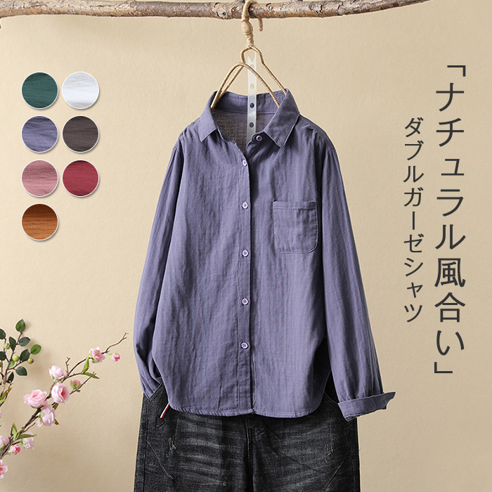 ダブルガーゼ シャツブラウス レディース ガーゼ シャツ ブラウス 長袖 トップス ガーゼシャツ 2重がーぜ 通気性 ゆったり 着回し 定番 重ね着 体型カバー