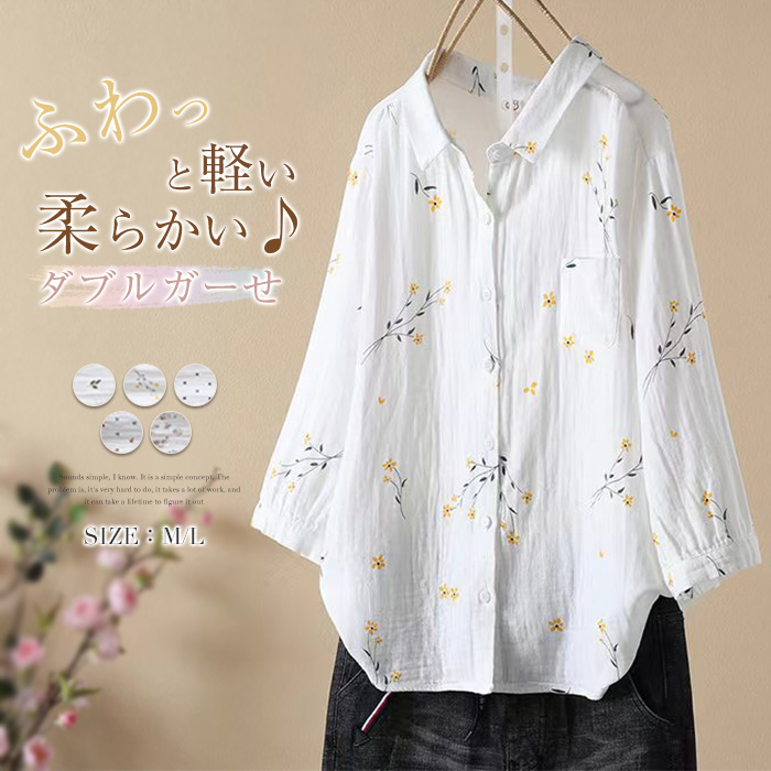 ふわふわで、柔らかく、着ていて肌触りが良い ガーゼシャツ 春夏レディース コットン100% 7分袖 シャツブラウス 花柄 着回し 着心地 柔らか