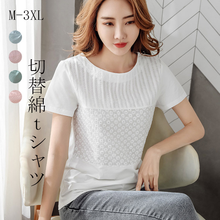 レースシャツ 切替Tシャツブラウス 20代 30代 40代 ブラウス カットソー トップス 綿 コットン 半袖