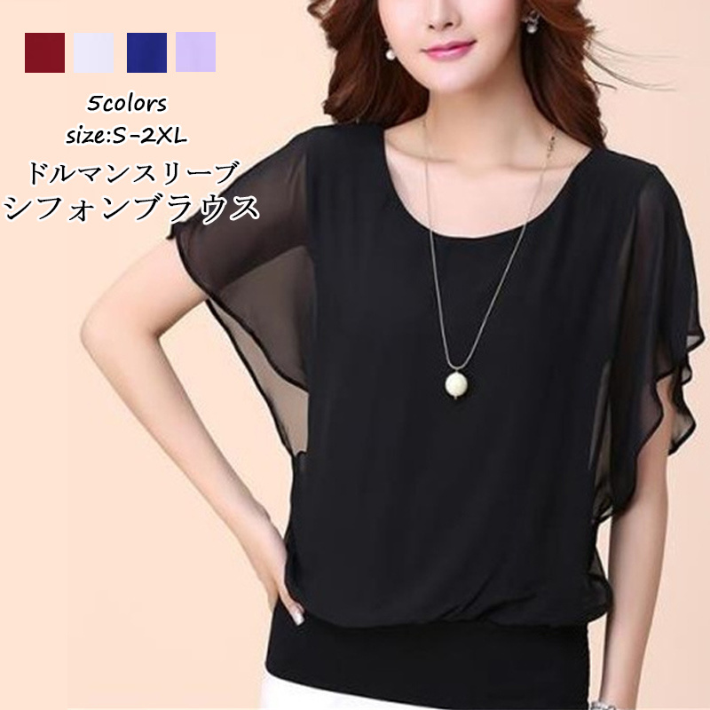 フェミニン 透け感 ドルマンスリーブ ブラウス お洒落 ブラック パープル ホワイト ブルー レッド プルオーバー ふんわり