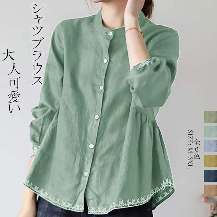 シャツ 綿麻 シャツブラウス ナチュラル シンプル トップス きれいめ 刺繍 カジュアル レディース 春服 夏服 可愛い