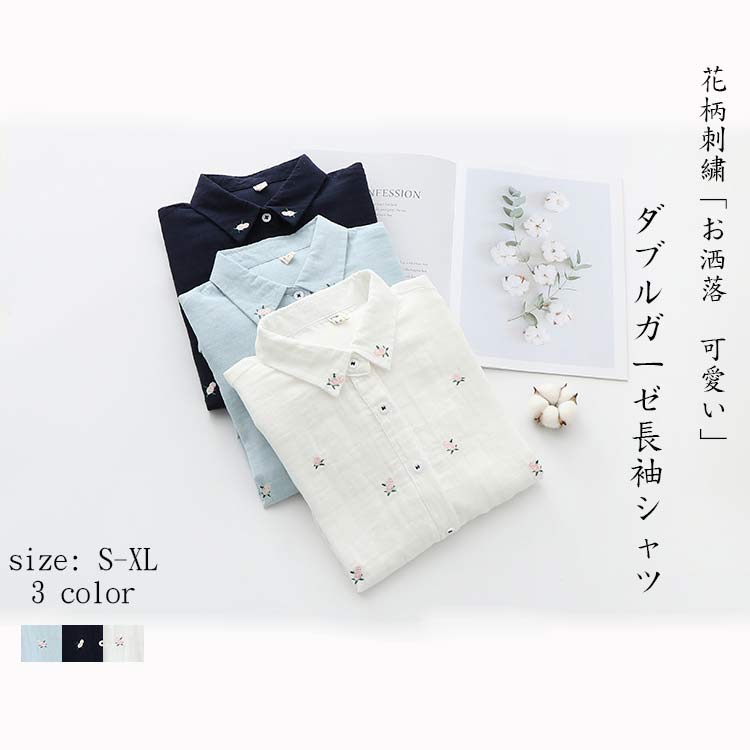 2重ガーゼシャツ レディース シャツ ブラウス カジュアルシャツ 半袖 長袖 小花刺繍 刺繍トップス 白シャツ ナチュラル 可愛い 綿 コットン ガーゼ 春 秋
