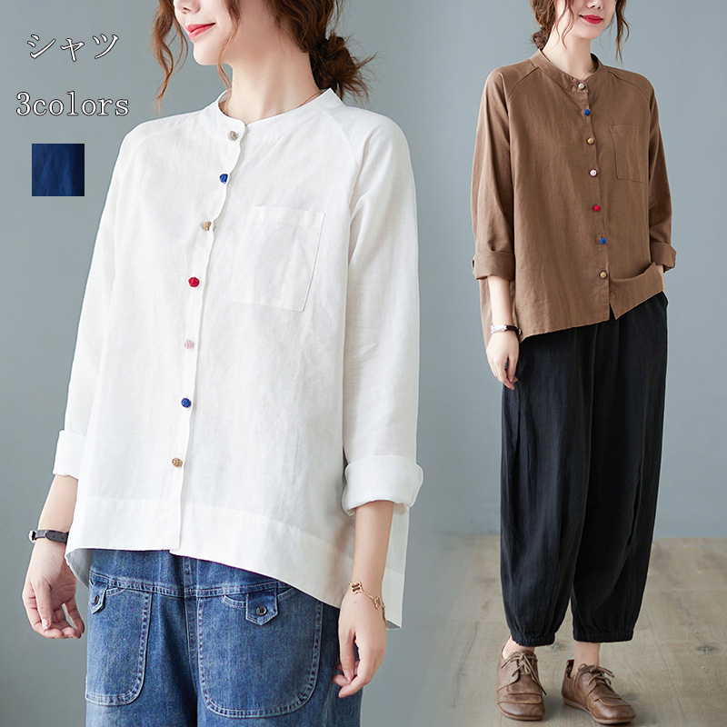 シャツ レディース トップス 春 秋 長袖 ブラウス 綿混 コットン 無地 ゆったり 立ち襟 大きいサイズ ゆったりシャツ おしゃれ カジュアル リラックス 30代 40代 50代