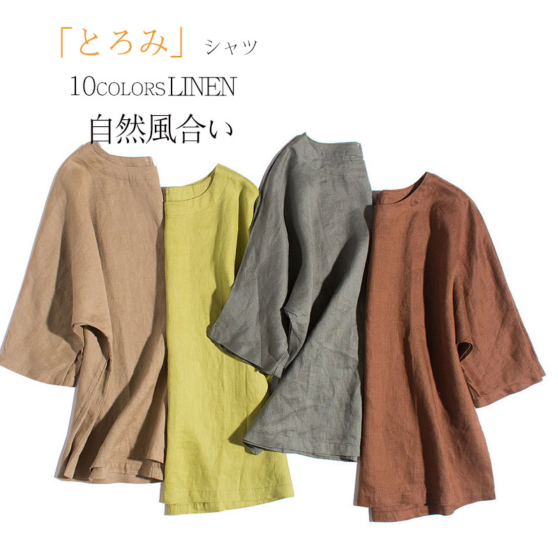 汗ばむ夏には着心地いいリネンシャツ 七分袖カジュアルプルオーバ リネンシャツブラウス プルオーバー 無地 10カラー展開 シンプル レトロ 白 黒 グレー ベージュ オレンジ カーキ