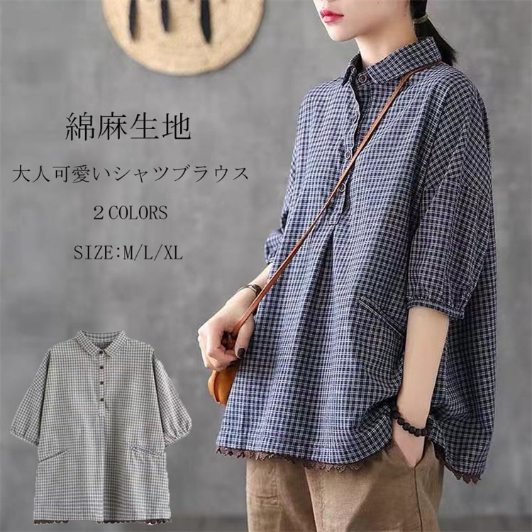 美しいシルエット演出する大人可愛いシャツブラウス チェック シンプル カジュアル オフホワイト ネイビー 綿麻 着心地がいい M L XL