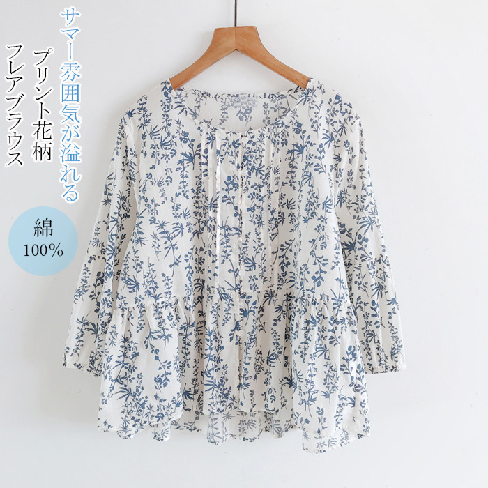 花柄プリントブラウス レディース ブラウス プリント 花柄 シャツ 綿100% ギャザー 前後差 シャーリング フレア ナチュラル 通勤 夏 楽ちん ふんわり 20代 30代 40代 50代