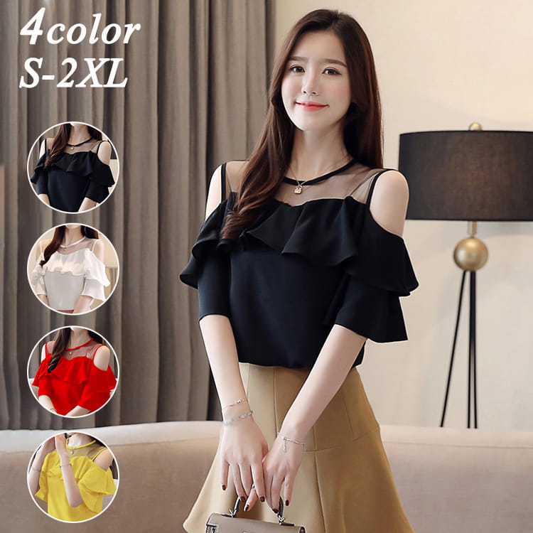 レディース シフォン レース 大きいサイズ 肩出し 夏 プリーツ フレア袖 フリル 上品 通勤 着痩せ キレイ ゆったり シャツ 新作 お出かけ 二次会