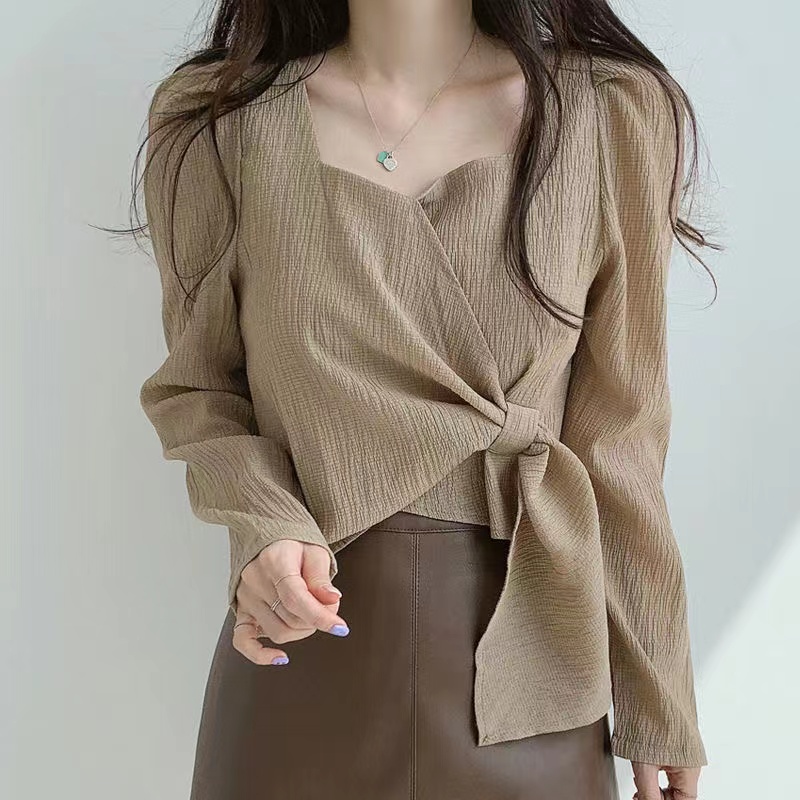 レディース トップス ブラウス 無地 春秋 通勤 可愛い 長袖 シンプル シャツ 薄手 杏色 コーヒー ブラック 2 022
